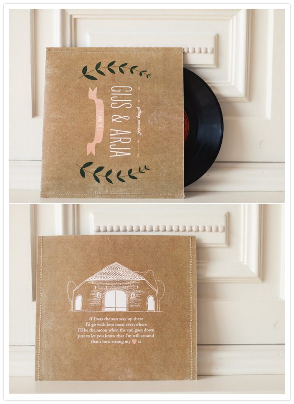 Gijs and I are musicians and also run a music blog, so we wanted the invitation to be very musical as well. Gijs bought a hundred love songs on 7” 45rpm records, and I designed a package which included the record, the wedding invitation with our love story on it, a hand drawn route to the locations and of course the album cover for the record. We printed, folded, sewed and wrapped the invitations ourselves. We even drove cross-country to deliver the packages (we live in a small country).