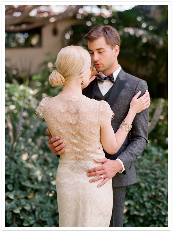 {on her: Claire Pettibone wedding gown, Platt Jewels earrings, Katerina Maxine bracelet / on him: John Varvatos suit, Jos Bank shirt, Michael M wedding band}