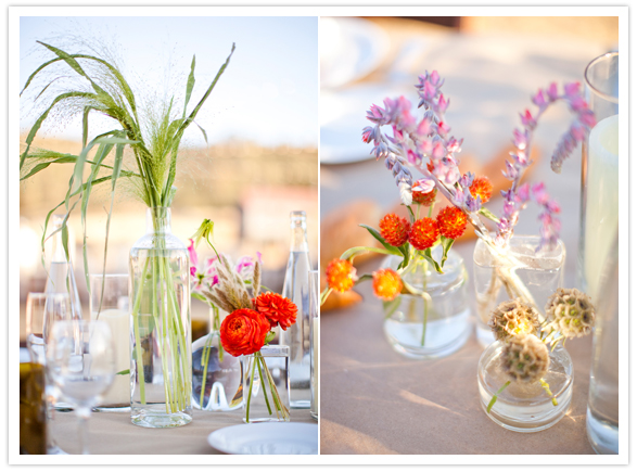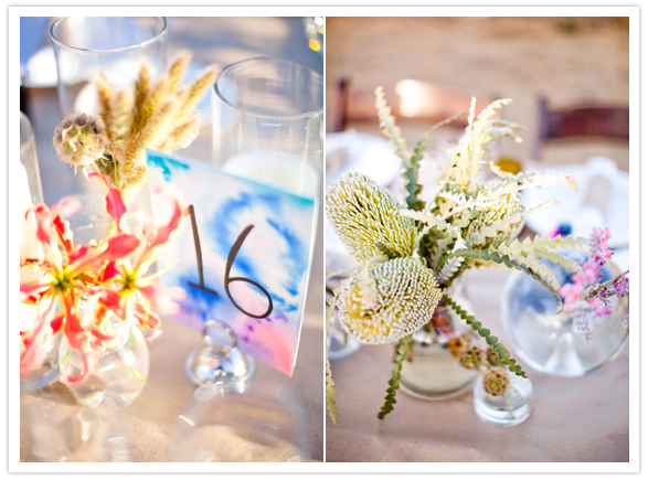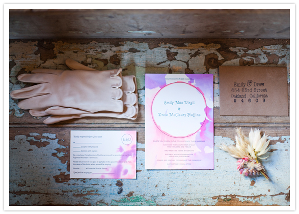 Emily + Drew are in love with California. The coastline, the purples, oranges and pinks seen daily in the sunsets and sunrises, the laid back ethos. Everything they’ve come to grow up with and love was exactly what they wanted to share with all 150 of their guests. There was a heavy focus on the handcrafted, both in water colors (the invites, bridesmaid dresses, escort cards, table no’s) and on wine (red wine vinegar favors, wine bottle glass vessels). The look and feel of their wedding was refreshing, so colorful, and beautifully captured by Nancy Neil.