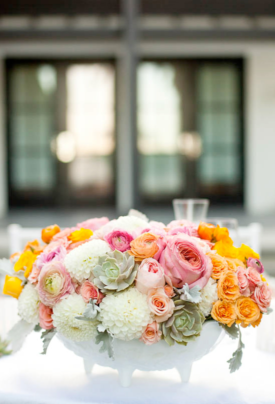 Since they had three very long tables, they liked the idea of  using different arrangements so that each table would look and feel full and not so uniformed. Brown Paper Design made this happen by creating groupings with various white vases filled with ranunculus, garden roses, succulents and bowls of citrus.