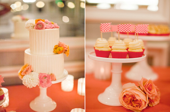 hanging twinkle lights and slender floral centerpieces Viceroy Palm Springs outdoor garden reception pink, gold and peach floral centerpiece and pink linens Jim Hjelm ruffled wedding dress two-tiered white cake adorned with pink and gold flowers and checkered flag cupcake toppers framed happiness by candlelight romantic twinkle light wedding portrait