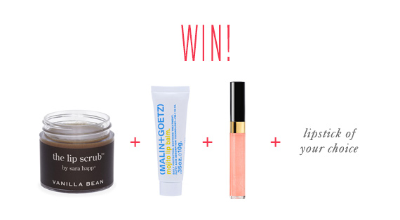 (clockwise) Sara Happ Lip Scrub / Malin and Goetz Mojito Lip Balm / Laura Mercier Lip Balm SPF 15 / Too Faced Glamour Gloss / Buxom Lip Polish / Chanel Glossimer