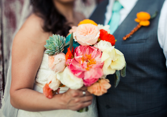 So, Chelsea’s bridal bouquet… how awesome are all those colors together? The recipe: peonies, ranunculus dusty miller, garden roses, poppies, and paper flowers made by her MOH.