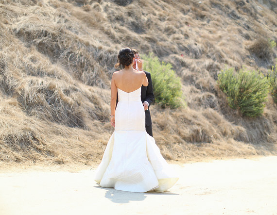 Bride and bridesmaids: Hair, makeup and nail design: Fiore Beauty / Ceremony dress: Jorge Manuel, from The White Dress / Ceremony shoes and rehearsal dinner gown: BHLDN / Reception gown: Monique Lhuillier / Reception shoes: Nicholas Kirkwood / Veil: Twigs & Honey / Ceremony and reception clutches: Ila Handbags / Cocktail ring and reception earrings: Yael Designs / Ceremony earrings: Kenneth Jay Lane / Glow: Plush Tan / Blue Print Cleanse / Bracelet: Rose Bowl Flea Market / Bridesmaid dresses: Kirribilla, Theia, ASOS, C. Luce / Bridesmaid shoes: Nina / Flower girl dress: Weddington Way / Bridesmaids’ gifts: envelope clutch from Roxy Marj, rhinestone bracelets from Rose Bowl Flea Market, embroidered hankie from Bumble Bee Linens, monogram stationery from Wiley Valentine, Essie nail polish