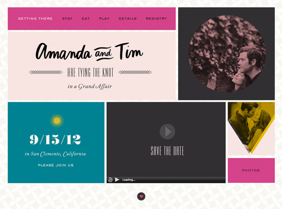 Our first kiss happened after a James Bond party a friend threw (as told here), so we thought it would be fun to give a nod to those early movies. Our first project was a save the date. Inspired by the opening credits to From Russia with Love, we collaborated with Scott Clark on a quirky video to announce our wedding and give our guests a bit of intrigue. The song in the video is Lujon, by Henry Mancini, and pretty much sums up the feeling we wanted our big day to portray. Here is a screen from our wedding website Tim and I created..
