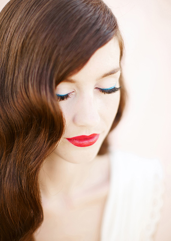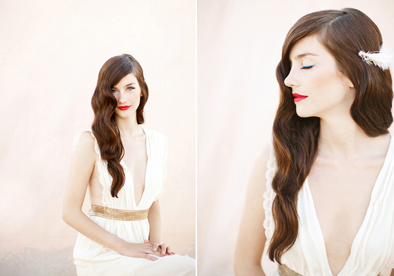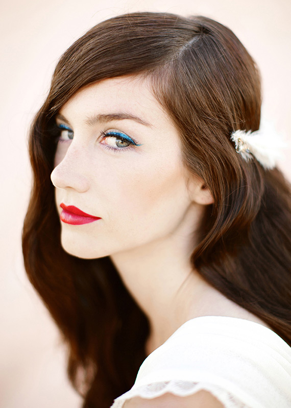 This is the perfect example of putting a twist on a classic look. The cat-eye liner is always a favorite amongst brides and by using color you can make it your own. Here we’ve used a turquoise blue but other colors like purples and greys can do wonders in bringing out your eye color. Finish this look with clean, sharp red lips and full brows. The hair has a classic retro wave to it yet it is still movable and soft. Instead of crystals or flowers a feather clip with gold accents add the perfect finishing touch.