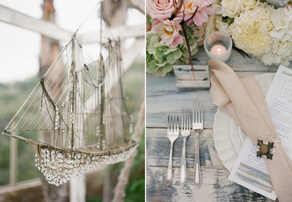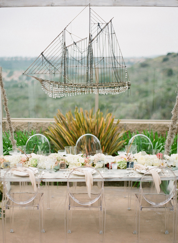 Our head table was literally floating! I designed our head table to be hanging from a structure with nautical looking ropes so that it was floating. I had found an old ship on Craigslist and my talented friend from Urban Barn (a vintage furniture store), strung it with crystals to create a ‘ship chandelier’ we hung from the center of the structure, over the floating table. Again it was surrounded by the Lucite ghost chairs to keep the feeling of it floating. Studio Fiore created a beautiful floral runner that hung off both ends of the floating table.