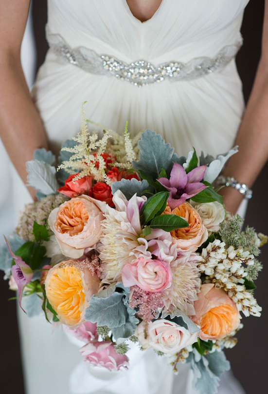 Kendel’s bridal bouquet recipe (gorge, right?): cafe au lait dahlias, roses, juliet garden roses, clematis, blushing bride, andromeda, astilbe, astrantia, dusty miller russian olive, sedum, ranunculus, and jasmine.