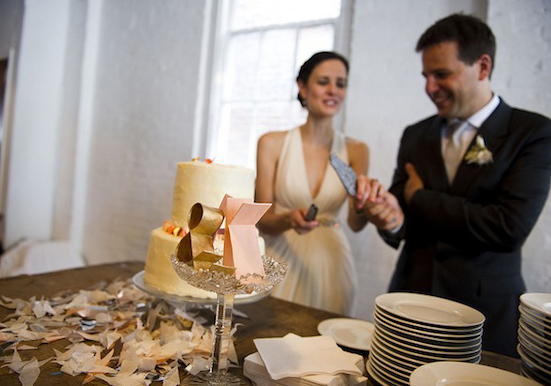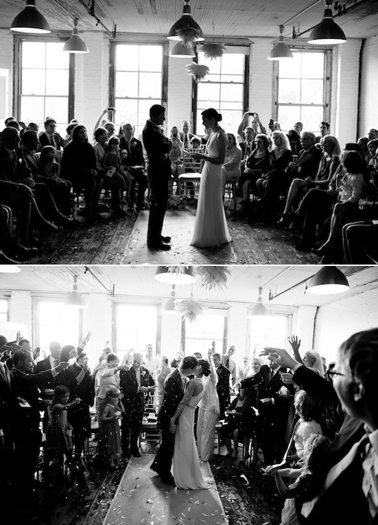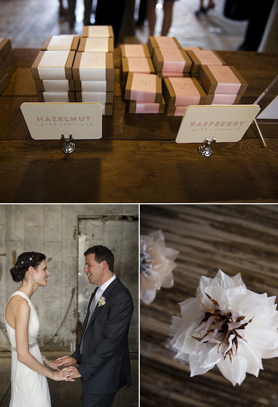 Photographer: Lauren Slusher / Venue: The Invisible Dog Art Center in Brooklyn / Day-of coordinator: Anna Leath at Just About Married / Hair: Daniel Rechelbacher, at Salon 2b / Florist: Kathleen Hyppolite, Katflower / Cake: friend Jane Lerner / Catering: Cobblestone Catering / Invitation Designer: couple collaborated on the design with Dever Thomas / Rentals: Party Rental Ltd / Ring Pillow: made by friend Kate Durkin / DJ: friends Piotr Orlov and Eric Demby / Bride’s Dress: Jenny Packham purchased at Mark Ingram Bridal Atelier / Shoes: BHLDN / Engagement Ring: custom made by Anna Sheffield / Wedding Ring: Greenwich Jewelers / Earrings & Bracelet: Ben Amun / Groom’s Suit: Paul Smith / Shoes: Barney’s / Tie: Hugo Boss, Shipley & Halmos / Wedding Party Boutonnieres: ban.do / Flower Girl Hair Clips: Anthropologie / Ring Bearer & Best Man Suits: J. Crew