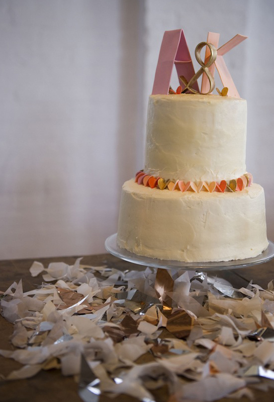 This wedding has definitely made us fans of the circular ceremony. When you see and hear from Kendel how special it was to them, and how fun it looks to be completely enveloped by friends & family as you make such intimate vows, you’ll probably feel the same way too. Their unique wedding venue, The Invisible Dog Art Center in Brooklyn was the perfect space for their ceremony and afternoon tea. All it needed was to feel a little warmer, so they brought in a few tissue pom poms, white Christmas lights and plenty of Confetti System garland.