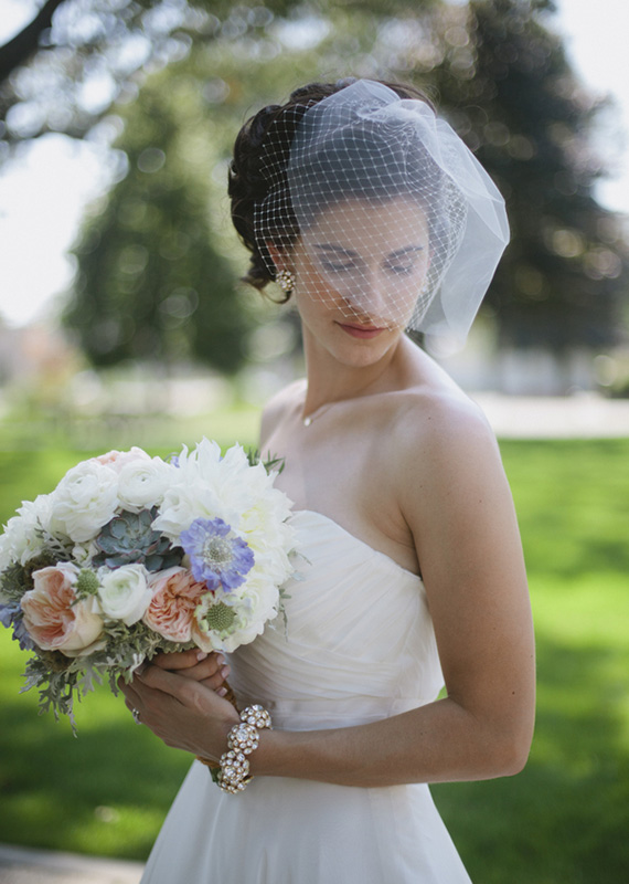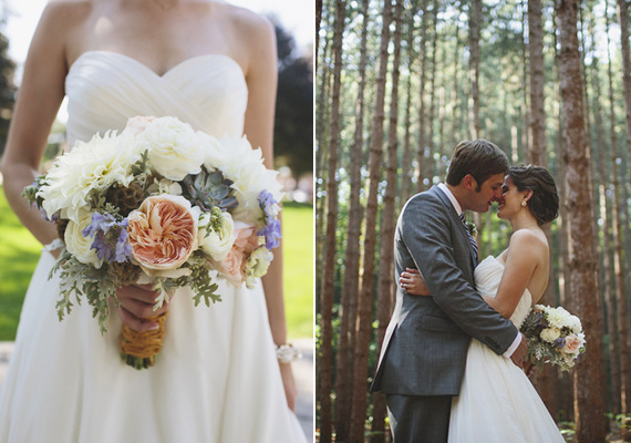 Jennifer’s bridal bouquet recipe: coral cottage roses, coral and white dahlias, white ranunculus, dusty miller, and succulents.
