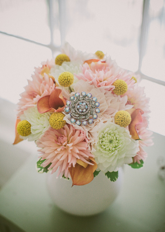 My bridal bouquet had “café au lait” dahlias, “embrace” dahlias, flame mini callas, ivory dahlias and craspedia pods. The stems were wrapped in a cream silk and incorporated my grandmother’s brooch. The brooch was my something blue and meant so much to me since my Grandmother had passed on. I felt like I had a bit of her with me down the aisle.