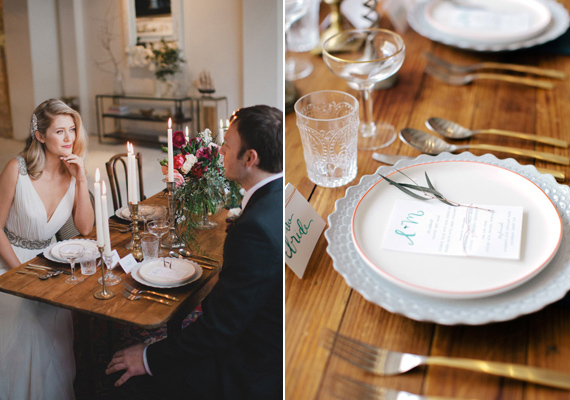 Stacy Anderson Design wanted to whip up some pretty inspiration for spring while staying away from the pastels and bring out the richer colors of the season. A jewel tone palette of emerald, navy, deep plum, and ruby felt just right, plus it tied into the industrial feel of the studio space that was used for the shoot. Don’t be fooled my that ornate gold mirror either, this isn’t an ultra glam shoot. The tablescape of vintage mismatched chairs & candlestick holders, simple but striking florals, and emerald watercolor invitations make this entire style an easy one to recreate. Click here to view the entire gallery of images!