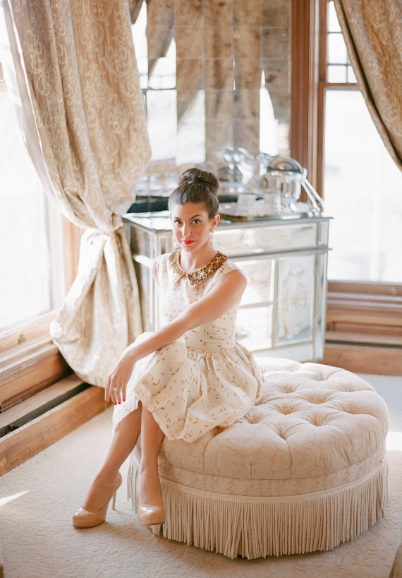 If vintage elegance is totally your thing, then get ready for a real gem of an inspiration shoot. Kate Romenesko Photography says, The inspiration for this shoot was a casual and intimate weekend getaway wedding with a few friends and family members, full of beautiful vintage charm. The setting for this shoot was in stunning Lake Geneva, WI at a beautifully restored mansion overlooking the lake. Hello glamorous jewels, gilded invitations, and chocolaty confections. And that sweet little bow printed number from BHLDN? Adorbs.