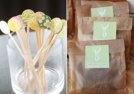 Our favor was deer jerky that my father-in-law hunted. A family friend smoked the jerky and his daughter drew the stag for the sticker, which read, “For our deerest friends.”