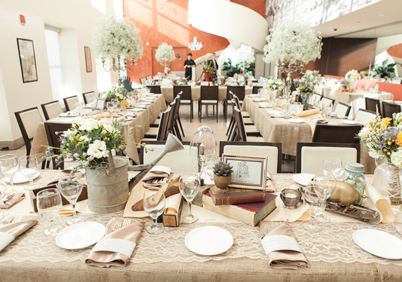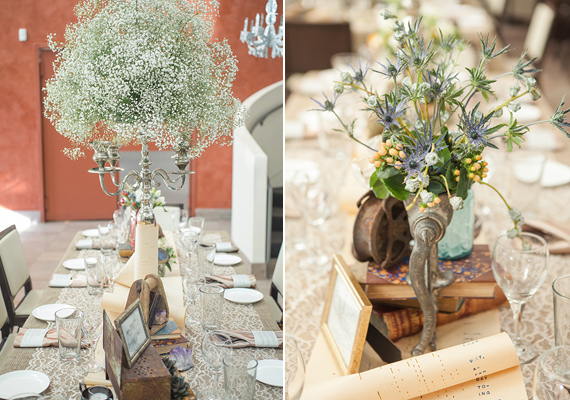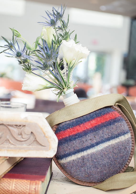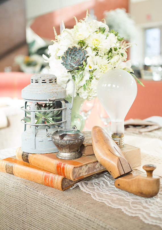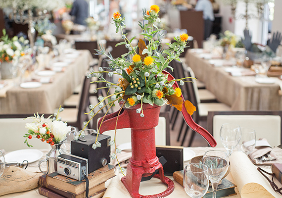 Ashley says, Instead of traditional floral arrangements, I decided to use pieces I’ve collected over the years. We thought it would be a great conversation starter; items like my grandmother’s meat grinder were filled with wildflowers.