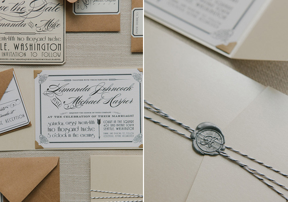 From Amanda: I spent the first three months of our engagement drooling over wedding blogs and the billion wedding magazines I had collected since being a little girl. I found myself gravitating towards something timeless with a neutral and metallic palette. I then asked Mike what he wanted our theme to be and he said with serious enthusiasm, “Indian Jones.” The world stopped and for a brief second I thought, “What did I get myself into?” After many questions trying to get to the bottom of what about Indian Jones he liked, we came to the conclusion it was the time period. The late ‘20s and early ‘30s—how well-made everything was, how dapper the men looked and glamorous the women, the attention to detail—and so our vintage Hollywood glam theme was born.