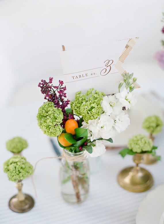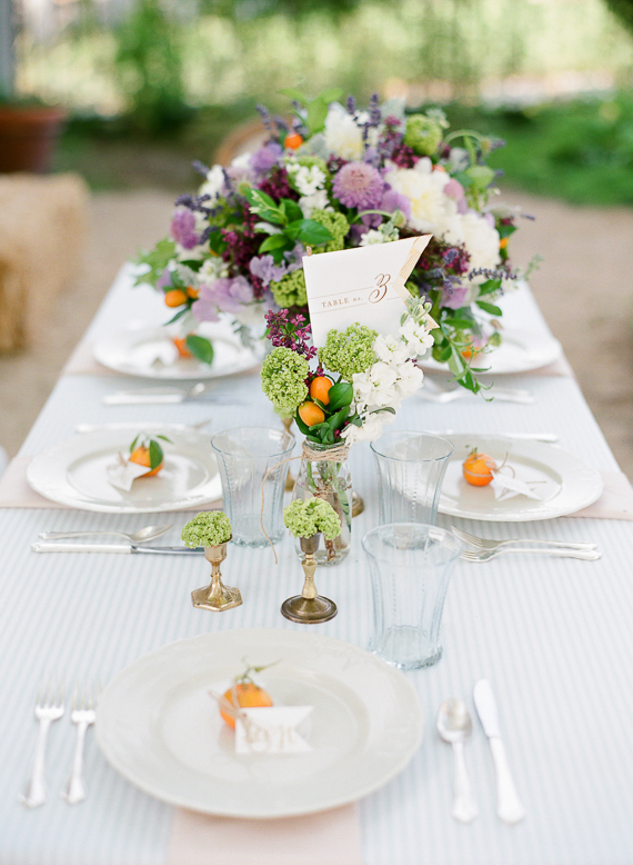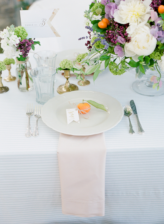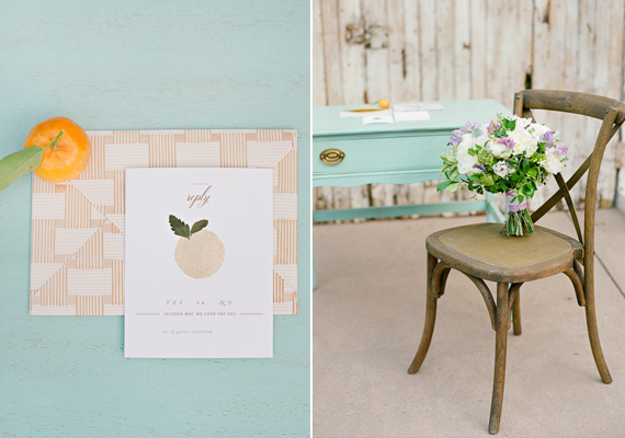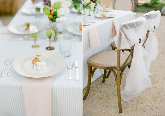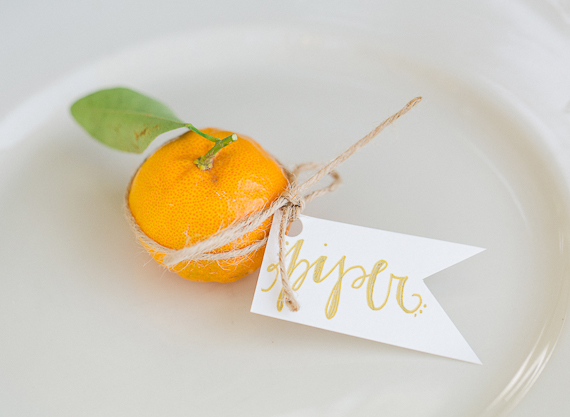 Maravilla Gardens boasts some of the most delicious citrus around, so I made good use of the tangerines that came straight from the venue! You can see the fruit and the color used in a variety of ways, including our place cards and the centerpiece by These Buds a Blooming.