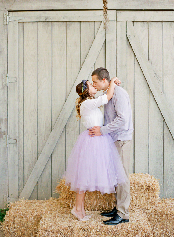 Joelle from A Charming Occasion says, Non-white wedding gowns are everywhere these days, but I’d yet to see anything lavender. So my first order was business was finding a pretty lavender tulle skirt for our blushing bride to wear. We paired it with a simple white button-up shirt and a lavender head wreath to bring the look full circle.