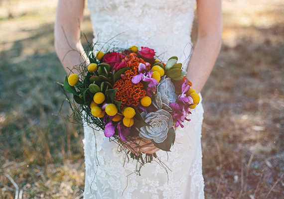 Emma’s motley bouquet recipe: billy balls, succulents, celosia argentea, purple orchids, magenta roses, and vines