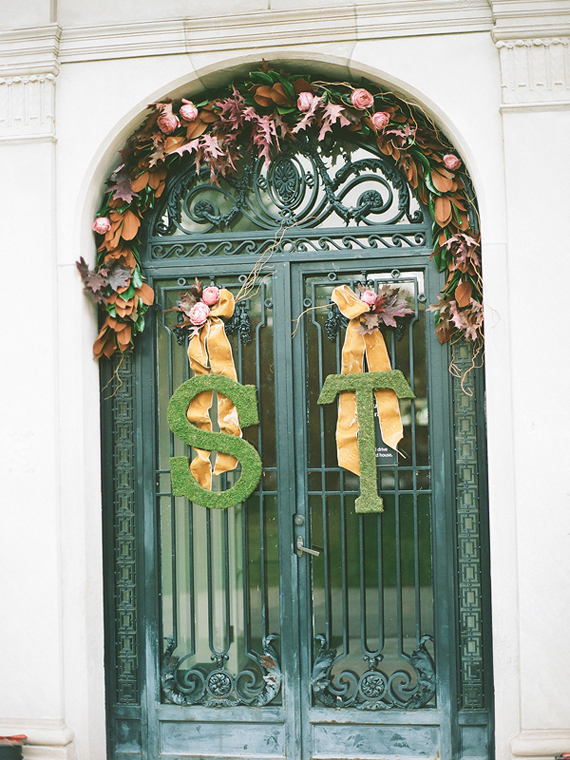 We picked a good one to kick off the beginning of fall you guys. The changing color of leaves, this one’s got it. Copper, dark reds, gold, greens – yep, that too. The entrance to this fete, captured by Stacy Newgent, set the tone perfectly. As guests entered through the mansion at the Oldfields–Lilly House & Gardens, a beautiful garland of fall leaves, flowers and magnolia branches capped the doorway with the initials S & T in moss welcomed everyone to Sarah + Tom’s 17th century Dutch still life inspired wedding. Click here to jump on over to the full gallery of images.