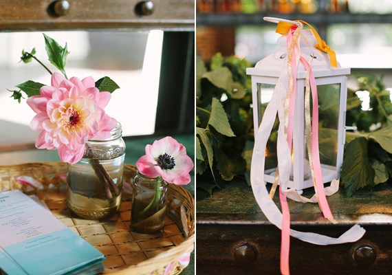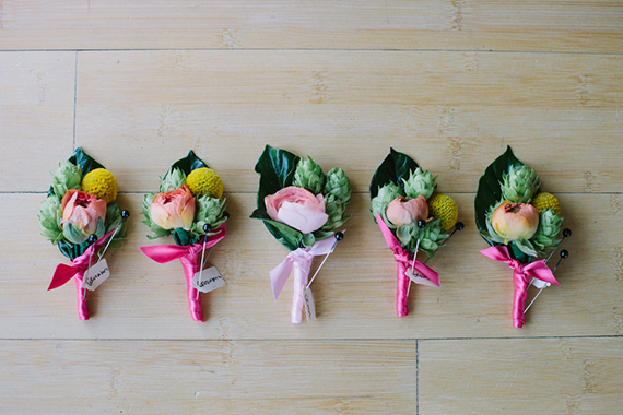 We’ve heard of couples loving beer so much that they brew their own batches for their wedding, or offer a carefully curated selection of craft brews to guests, but we’ve never heard of a couple loving it so much that they use ingredients in their floral arrangements. This is new to us, but we’re digging it. If you look at Taylor’s bridal bouquet closely you’ll see hop vines sitting pretty next to peach ranunculus. You’ll also see them in their centerpieces further down along with all their other pretty, colorful details captured by Sarah Joelle Photography.