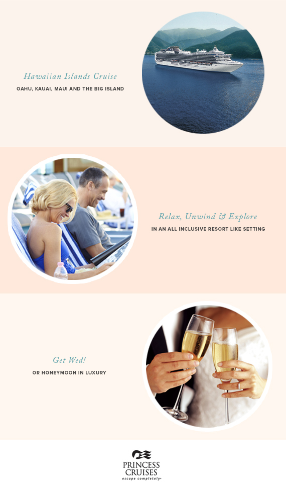 These are some of our favorite posts to put together, because we instantly start to daydream the second we hit publish. Plus, we love to share ideas for honeymooning, especially when it involves Hawaii. And really, honeymooning is kind of one of the best parts about getting married, right? Think of it as your pay off and reward for spending all those months planning and DIY’ing for your wedding. Hopping on a cruise ship with Hawaii as its destination, with your babe the day after your wedding will sound amazing after you’ve said goodbye to your last wedding guest, promise. Princess Cruises makes it incredibly easy too. Once you’ve booked your cruise, that’s virtually all the planning you have to do!