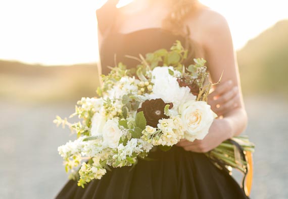 Bouquet recipe: cream roses, black dahlias, white veronica, cream hypericum berries, cream stock, mint, white peonies, white larkspur, origanum, and gold grevillea.