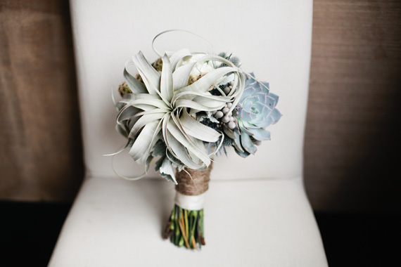Bouquet recipe: The Tillandsia airplant was the focus, surrounded by scabiosa pods, blue thistle, silver brunia, succulents, white mini carnations, accented with dusty miller and tied with off white satin ribbon and twine.