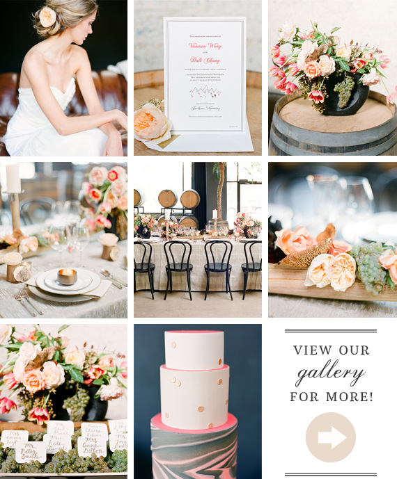 We’re pretty excited about this inspiration shoot. It’s the first studio collaboration to come from the ladies of Good Company, a boutique wedding vendor collective comprised of some of the most talented wedding professionals in San Francisco. Take note Bay Area couples. It’s not a bad idea to have these folks by your side while you plan your wedding. And if you’re looking for a great space, Tank 18, in the heart of SF, is the new talk of the city. Its wooden beams, chalkboard walls, wine bottle art installations, oak barrels, and expansive bar were just the tipping point for the inspiration behind this romantic and modern look.