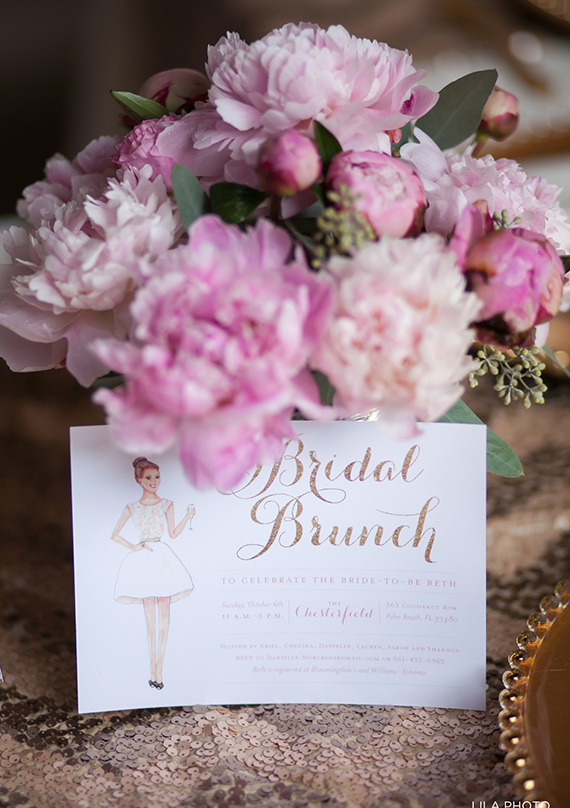 These are a few pretty lessons we learned from Beth’s bridal brunch: If you’re going to have cotton candy, make sure it’s served atop a glitter cone with a sparkler in the middle. If you have to pick just one flower to showcase in your arrangements, peonies are always a fab way to go. And finally, add sequin table linens for an instant touch of glam. Bride-to-be and event planner by day, Beth of Beth Beattie Branding, PR and Events and Palm Beach Lately had just about the sweetest gold + pink bridal shower. But then again, when you’re an event planner, it’s almost guaranteed you’ll have a fabulous fete, right? Check out all the pretty details!