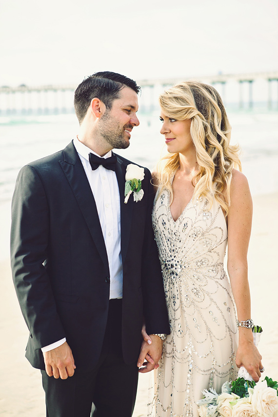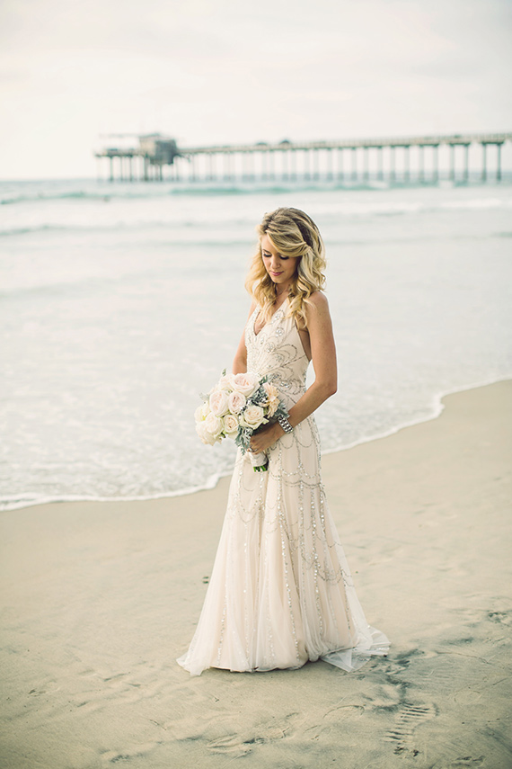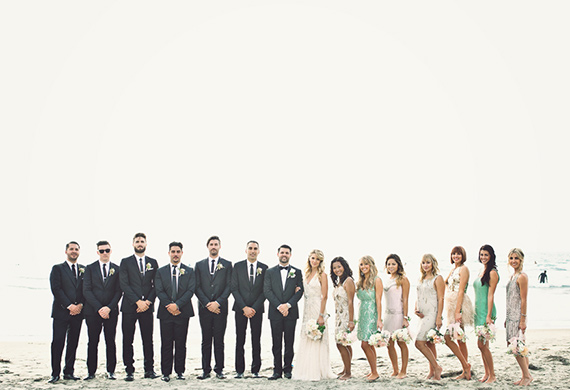 Oh California, how we love you and your beachside weddings. Ashley + Danny had the ultimate SoCal wedding. She’s always had dreams of being a mermaid, he’s always loved the beach, and together they’ve shared a love for classic rock. So naturally they incorporated all of that into their wedding. She wore a beach goddess-like Jenny Packham dress, their escort cards were “backstage band passes”, their colors were seafoam green + peach (with a side of sequins), and they ended the night by jumping into the ocean.