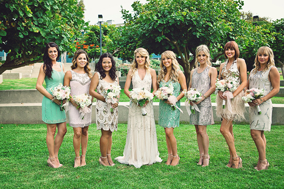 Photographer: Amy Lynn Photography / Videographer: Max and Molly Films / Ceremony & Reception Venue: Scripps Seaside Forum / Event Coordinator + Designer: Beau & Arrow Events / Invitation Designer: Minted / Hair & Makeup: Disconnected Hair Salon, Makeup by Cara Spezza and Alex Ott / Florist: Laura Alanis from Sada Flowers / Cake: Sweet Spike’s / Catering: Crown Point Catering / Rentals: Moss Vintage Rental and Classic Party Rentals / Wedding dress designer: Jenny Packham purchased at Erin Cole in Newport Beach / Hair comb: Etsy / Bracelet: vintage bracelet / Groom’s Suit & Shoes: John Varvatos / Bridesmaid dresses: Bebe, Rock My Vintage, 2B Bebe, My Violet Hill, Alice + Olivia / Ring Bearers & Flower Girls: Etsy / Table linens: La Tavola Linen