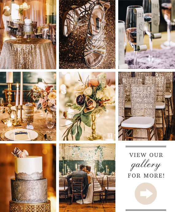 We did not try to mask the rustic features of the space, but rather showcase them by framing them in soft lighting and draping. Additionally we added luxury linens both to the ceremony and reception areas,which included sheer gold sequin chair covers at the ceremony and alternating gold lace and gold sequin tablecloths for the reception tables.