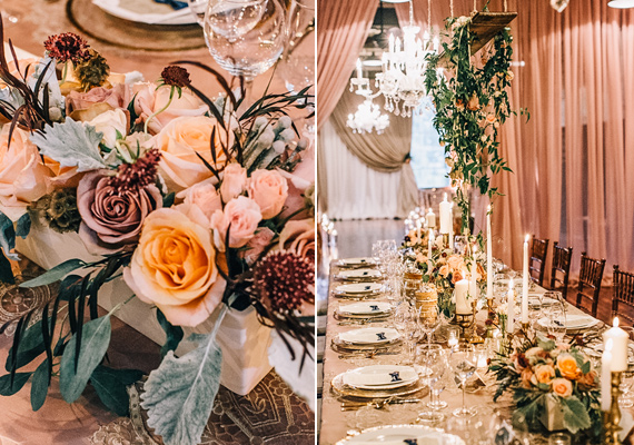 You can never go wrong with hanging floral garlands, right? Such a great dramatic feel hanging above the dining table too.
