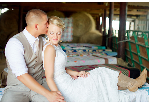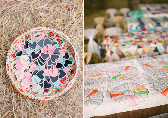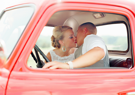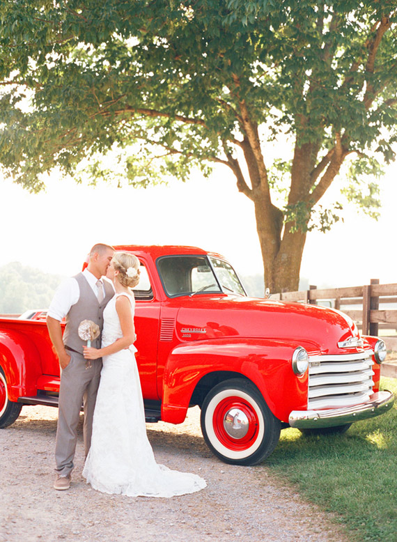Photographer: Chris Cornwell / Ceremony & Reception Venue: Private residence / Wedding design (flowers: Bride / Hair & Makeup: Angela Cox / Cake & Cupcakes: Debbie Bardin / Catering: Steve Porter (Bride’s uncle and other family chipped in) / Crafters: Bride, sisters & friends! / Vintage truck: Alex Montgomery / DJ: Steven Williams / Wood signs, mason jar chandeliers: Father of the bride / Quilts: Borrowed from friends & family, others purchased at auctions