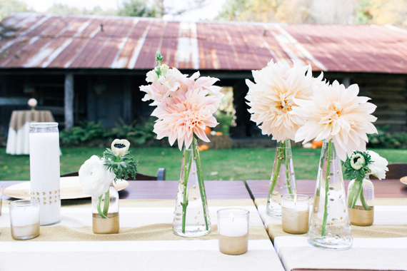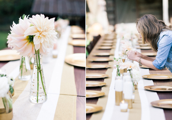This must be our lucky week! Yesterday Kelly Perry of Philosophy Flowers and Sara Logan Photography shared a rad DIY bouquet recipe on le blog. And today these two are back at it again with even more crafty inspo. This time Ms. Perry is showing us how to turn up the wedding day glam using gold paint from your local craft store. With a little effort, ordinary candles and vases turn into gilded masterpieces. Let’s get started, shall we…