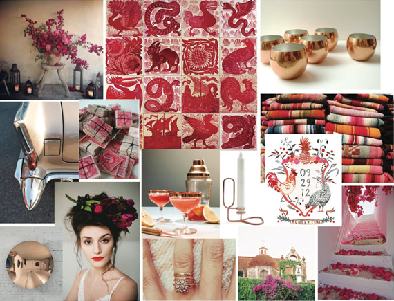 But first, here’s this year’s inspiration board, to give you a little taste of what you’re in for. Prepare yourself for all kinds of modern folk-themed cuteness. Think Mexican tiles, a monochromatic red color story, bougainvillea, and modern copper fixtures.