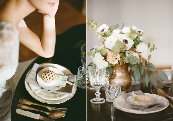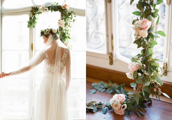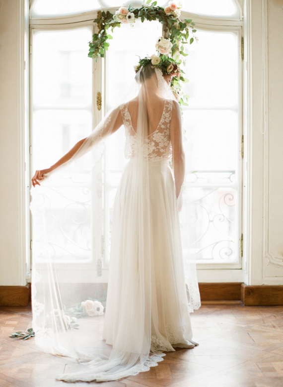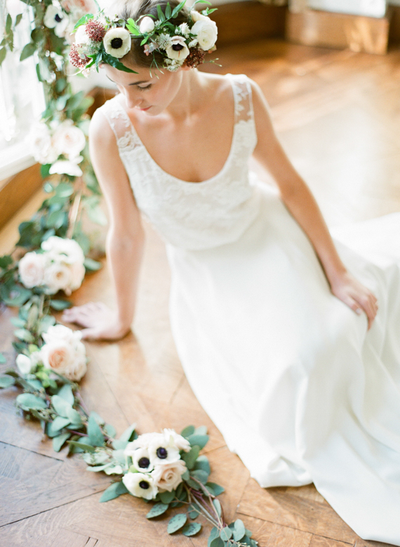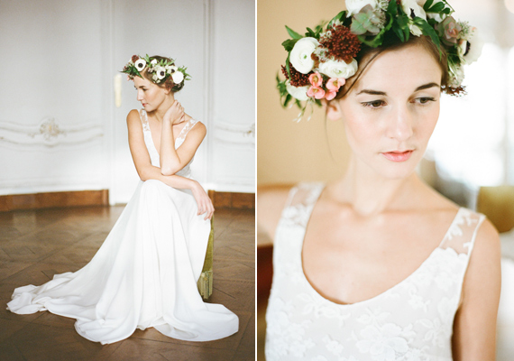 Parisian inspired anything always gets our hearts a flutter, but this styled shoot was actually shot in Paris, in a private residence just a stones throw away from Le Louvre. It was also designed by La Marièe Aux Pieds Nus for Made in You, soooo it’s legit. The beautiful model’s name? Noèmie. And the natural floral arrangements were made by Madame Artisan Fleuriste… see what we’re doing here? Trying to drop as much French as possible, because we can. In all honesty, this is one of our favorite bridal looks. Minimal makeup, a delicate and simple gown, a flower crown (obvs), with decor to match. And let’s not forget the beautiful photos (all shot on film!), by Greg Finck!
