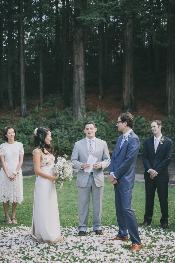 Susan says, I would describe our inspiration and concept to be an end-of-summer, simple and intimate dinner party at an old mansion tucked away in the Redwoods. We wanted the party to be true to us, so we took the traditional wedding concept for a spin and made it a modern celebration that reflected our styles.