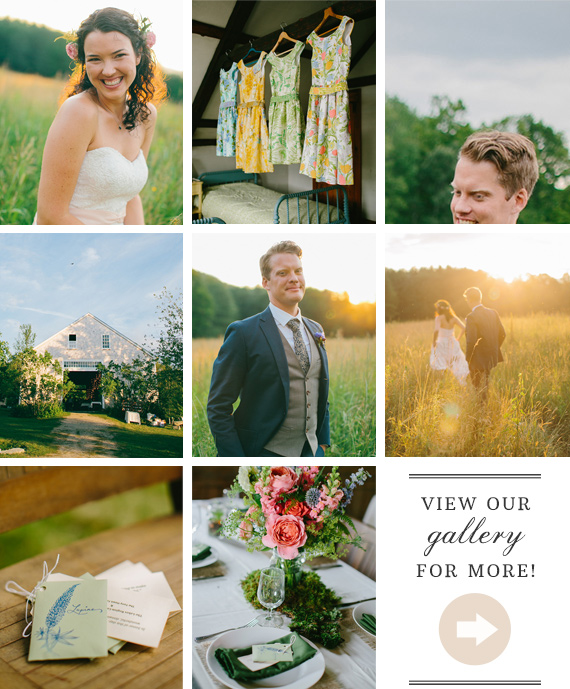 Photographer: Emily Delamater / Event Design & Planning: Bride / Venue: Moody Mountain Farm / Hair & Makeup: Bride / Florist: Linda Straubinger (bride’s mother) & Galina King / Invitation Designer: Bride / Letter Press: Lion in the Sun / Pies & Bread: LaBoca Bakery / Catering: Corner House Inn / Rentals: Special Events of New England / Bride’s Dress: Watters reworked by The Williamsburg Seamster / Shoes: Vintage / Pocket Square: Bride’s Grandfather’s / Groom’s Suit: Epaulet / Shoes: Frye / Bridesmaid Dresses: Custom vintage fabric dresses made by Louise Hedley from Sohomode