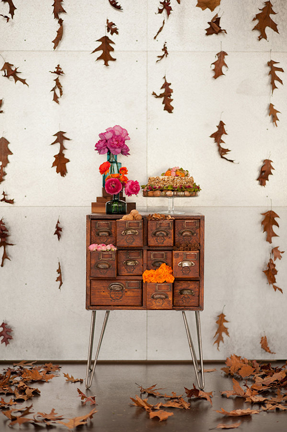 These folks sure know how to make use of a cool piece of vintage furniture! Love the seedpods, nuts, roses, and marigolds spilling out of the cubby drawers.
