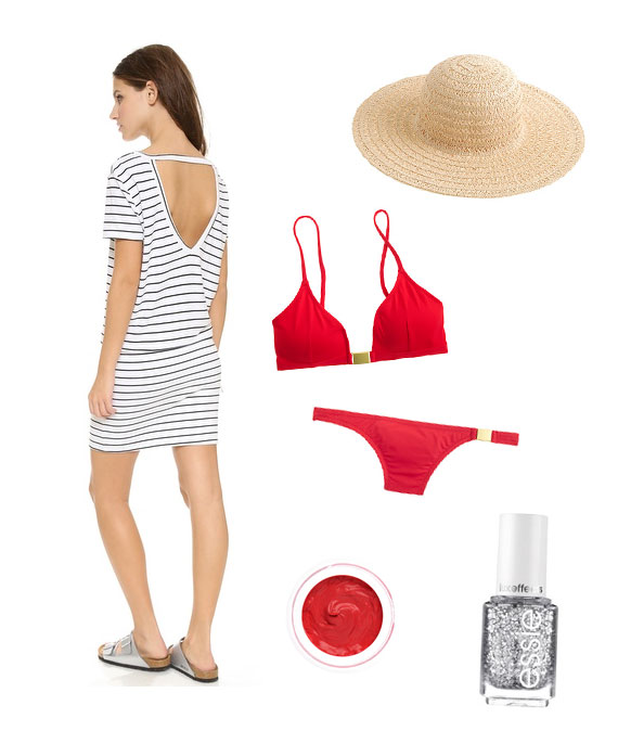 Pinstripe dress | Silver Birkenstocks | Hat | Swimsuit | Nail polish | Lip and cheek color