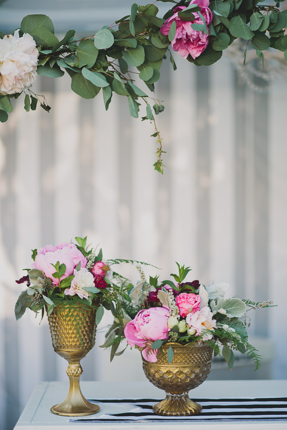 My fiancé and I both love Parisian culture and as soon as the theme was decided I started thinking of ideas that were a nod to the culture, without being too over the top, sort of a bistro-chic style. The party was held in my parents beautiful backyard. I had black and white stripe runners made for the tables and hand painted all of the signage, dessert backdrop and gold vessels for the flowers. The flowers! Shindig Chic is so incredible. The garland that hung on the cabana made my heart happy!