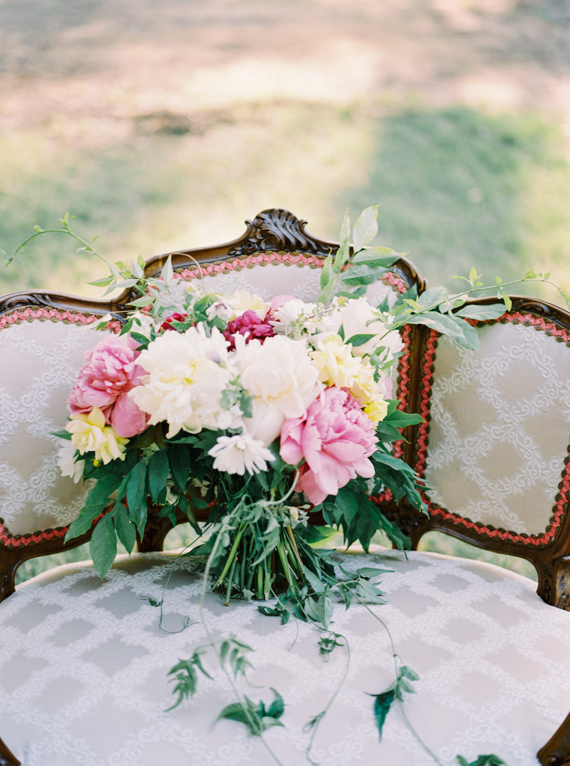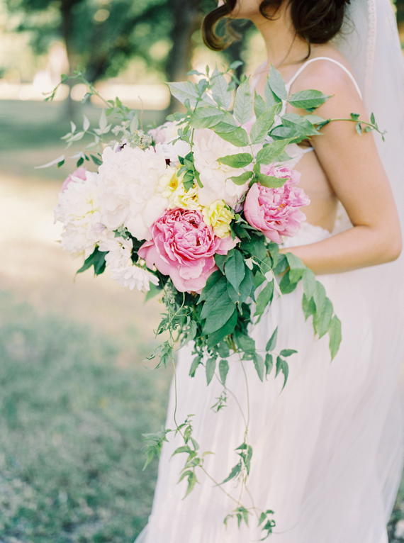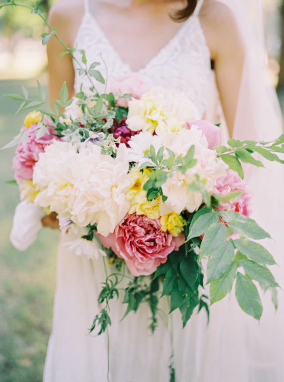 Helllooooo, peonies! The bridal bouquet included fresh yellow garden roses; pink, cream, and blush peonies, foraged wisteria, and jasmine.