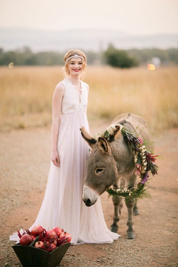 Tamlyn says, We love the diverse textures of the shoot, from the pomegranate arils to the raw wood pieces, the soft velvet jacket, opulent antique red chair to the whimsical flighty fabrics of the dresses. Throw in a donkey, what’s not to love?!