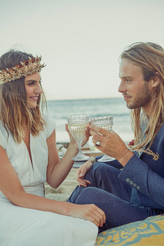 Photographer: Hailley Howard / Location: Private Emerald Bay beach in Laguna Beach, CA / Florist & Styling: Cargo Creative / Wardrobe Styling: Marnika Weiss / Hair & Makeup: Syndey Creates / Dress: Michelle Mason / Crown: Amaroq / Groom’s Suit: Topshop / Groom’s Tie: Apolis
