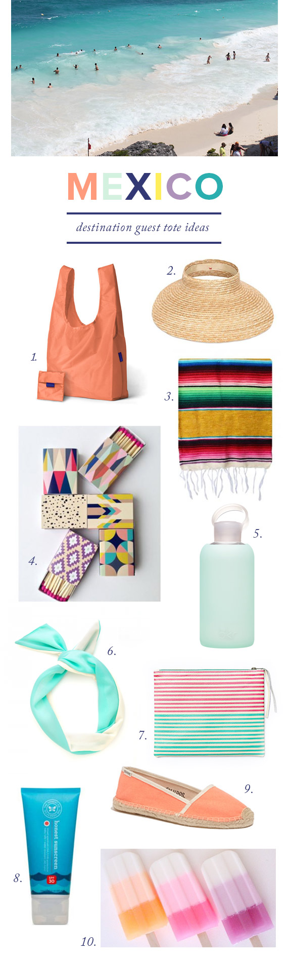 All you long time cakies may recall a few of our guest tote ideas in the past. What can we say, we’re all about those details. And for a destination wedding, the welcome bag is a super fun detail to show your guests just how much you appreciate them hopping on a plane to celebrate with you. After learning about the travel pros at Weddings by Funjet, we were inspired to create a Mexico-themed tote for one of our very faves (and their most popular) wedding locales, Riviera Maya.