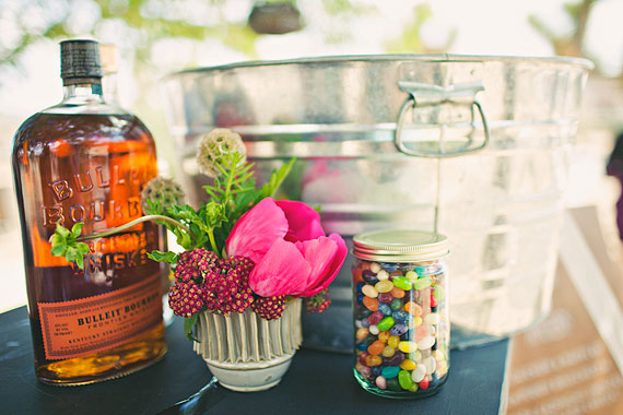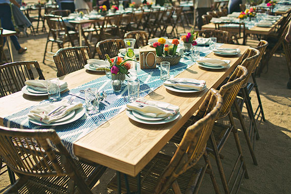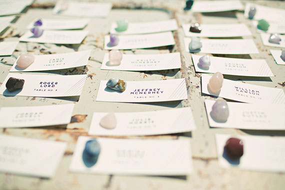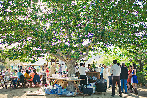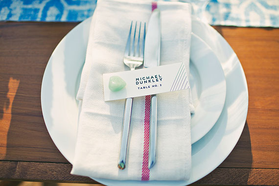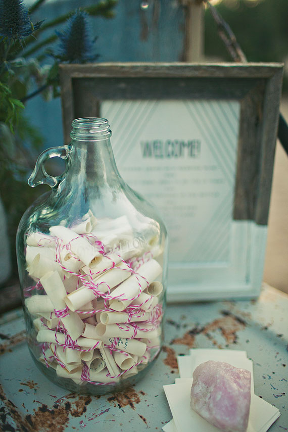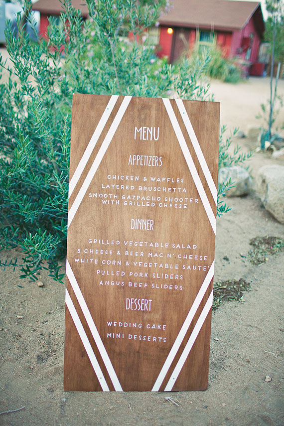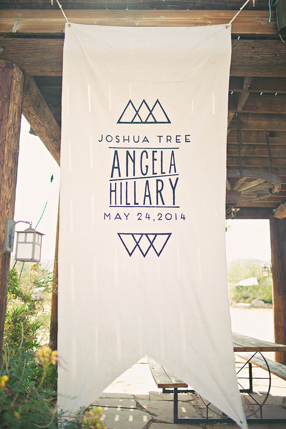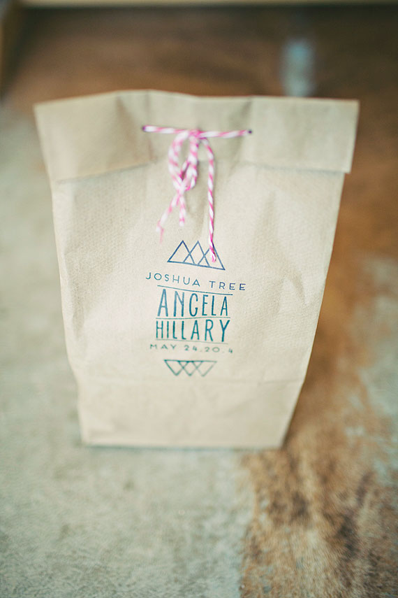 We planned and sourced all our favorite alcohols and made fresh squeezed juices and simple syrups and even cubed our own ice when we got there for our signature cocktails (Angela is nutty for those perfectly square cubes). We chose special gemstones and had our wedding party attach them to escort cards. We brought pre-cut paper and string for guests to leave us well wishes in our homebrew growler. We created welcome bags for our guests and spent the first day in the desert delivering them to our guests’ vacation homes and hotel rooms. Our wonderful coordinators, Hello Gem, sourced table runners and napkins, came up with a brilliant table design, designed our invitations, signage, hand-painted our menu, and created a huge banner with our wedding logo, not to mention coordinated with all of our vendors to ease our stress and helped the day go smoothly.