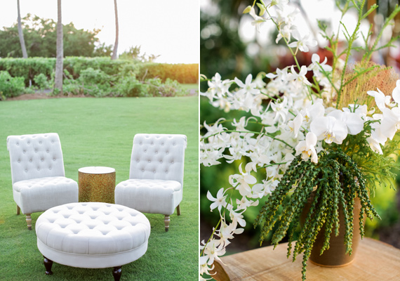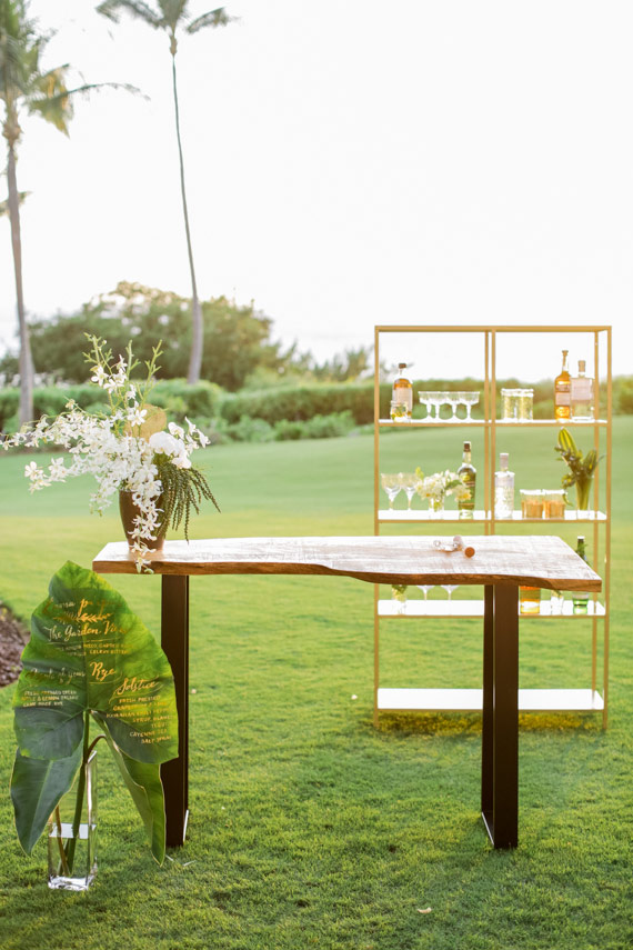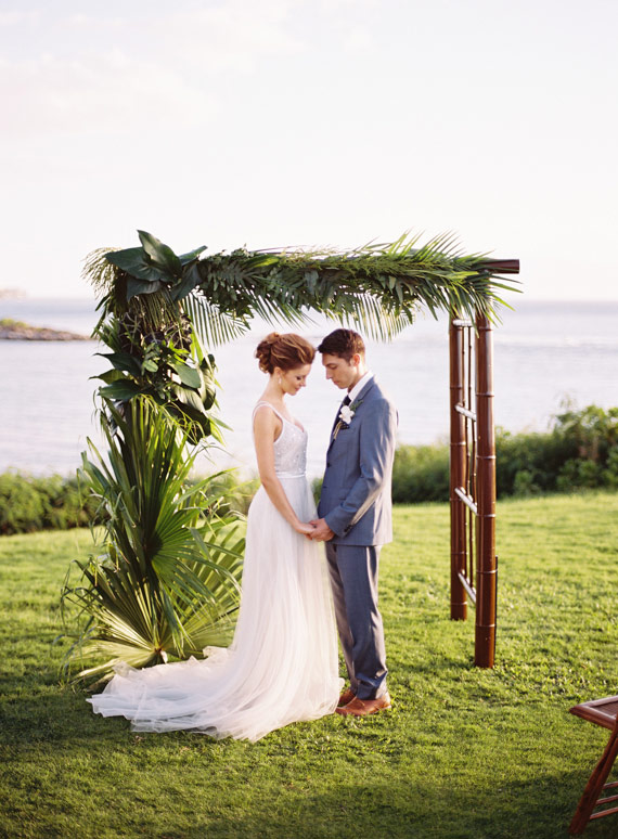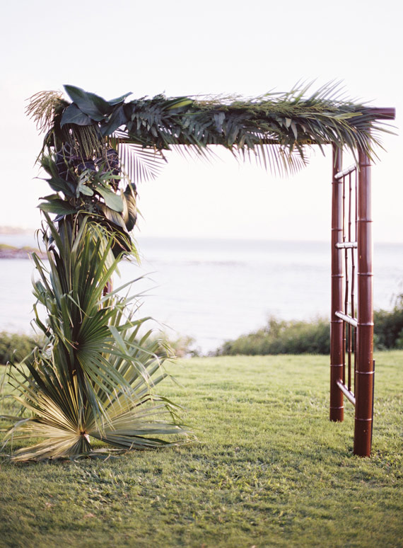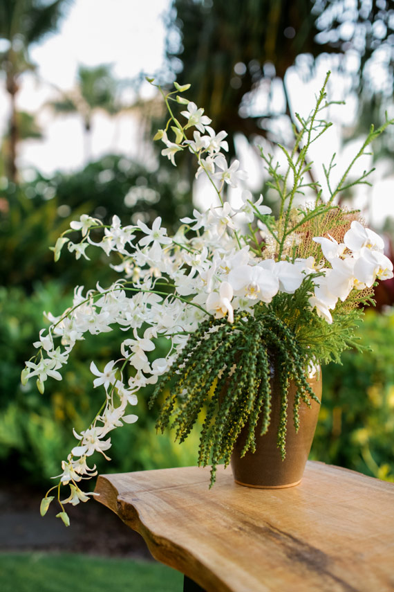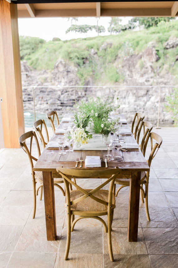 Lindsay says, Using local tropical greenery and florals of natural greens and whites we were able to use the blue ocean and cliffs as our backdrop to this neutral palette. Props to Maui-based Wildheart on these fabulous tropical arrangements!